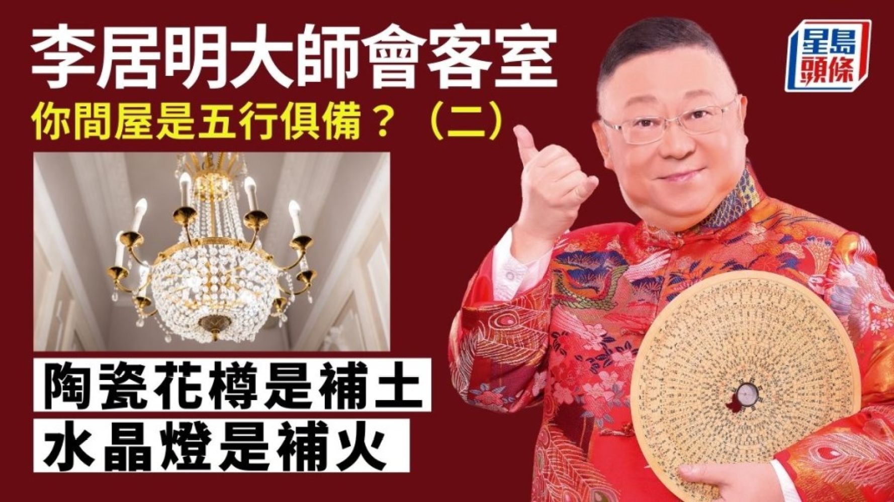 「金木水火土」中,「火」一定是代表家中的燈。我曾在玄學紀錄片《致富者聯盟》中教大家發達秘密,家中最好有水晶燈,也叫「發財燈」,燈膽好像一支支蠟燭,燈泡數量越多越好。燈原來也很勢利的,就是你本身房子很大和樓底很高,你就可以掛水晶燈。但是如果你家細,而樓底又矮,是掛不到水晶燈的,所以燈都好勢利。因此,水晶燈可以招來富貴,這個也是玄學的奇妙資訊。