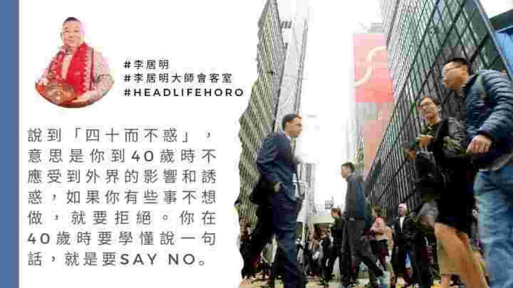一個人在15歲要立志,30歲要令自己的事業愈做愈大,說到「四十而不惑」,意思是你到40歲時不應受到外界的影響和誘惑,如果你有些事不想做,就要拒絕。你在40歲時要學懂說一句話,就是要Say No。