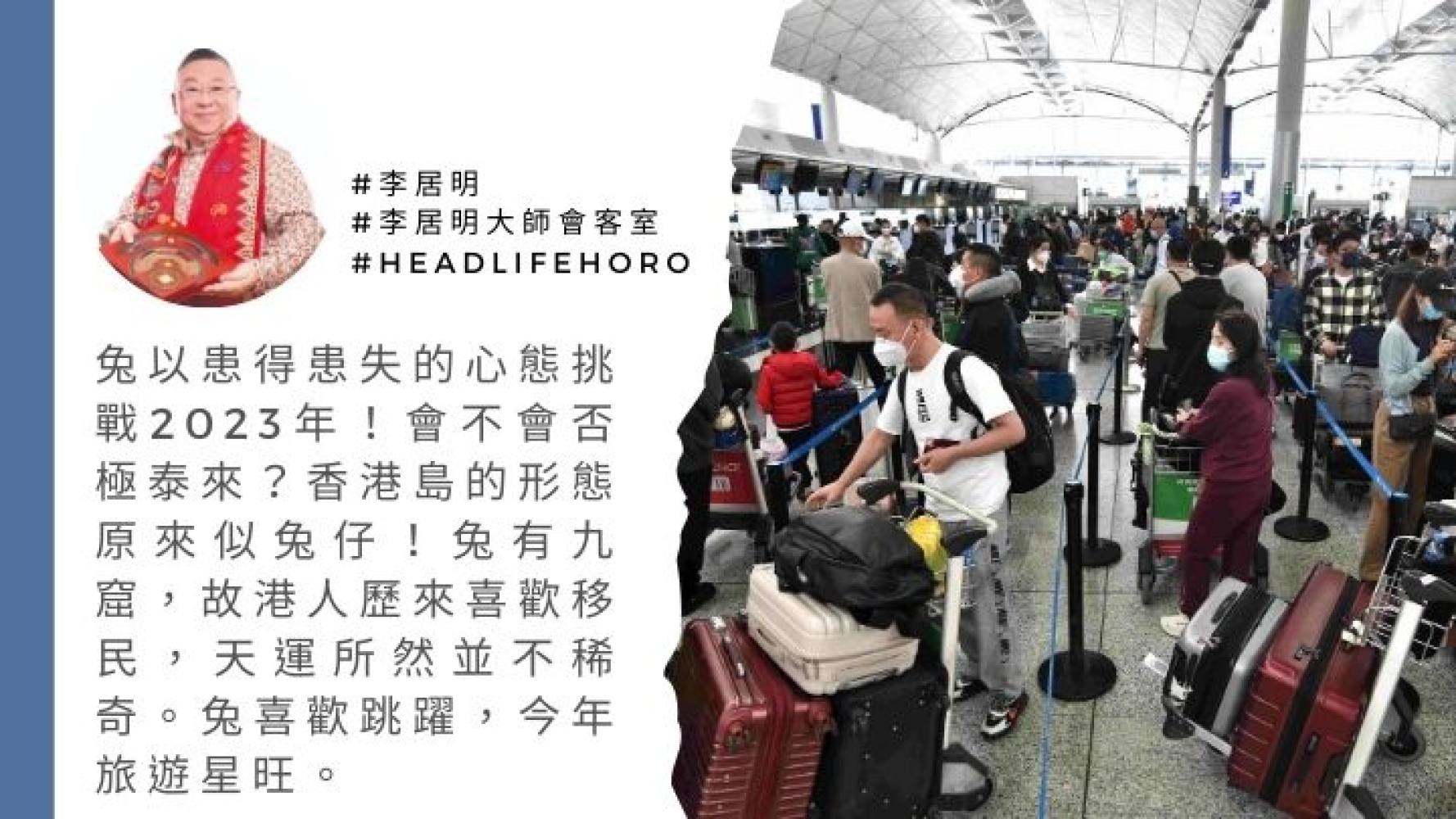 先講兔,過去兩年運程沉悶,明年值太歲。兔以患得患失的心態挑戰2023年,會不會否極泰來?你知道嗎?香港島的形態原來似兔仔,兔有九窟,故港人歷來喜歡移民,天運所然並不稀奇。兔喜歡跳躍,今年港人旅遊星旺。