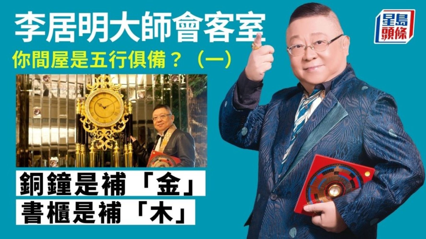 鐘代表金,所以一定要擺金鐘。有些鐘會發出「叮噹叮噹」的報時聲,還有鐘擺,這類鐘是化二黑五黃之外,亦是可以補金。就是說,如果你家裏缺了西北角,或者缺了西角,不用擔心的,因為你有個鐘,你就可以補了那個缺角,所以這個就是神秘武器。現時很多鐘是用塑膠做的,只要是圓形和金色也算過關。