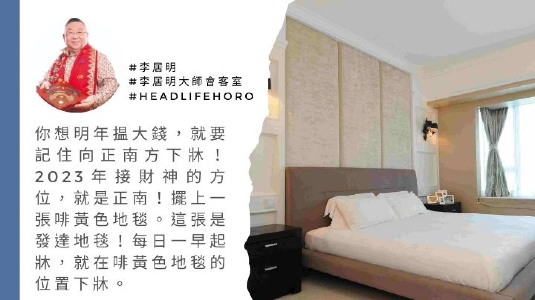 你想明年揾大錢,就要記住向正南方下牀!2023年接財神的方位,就是正南!今天晚上,你拿手機在牀上測清楚正南方在哪一邊?擺上一張啡黃色地毯。這張是發達地毯!擺在你張牀的正南方。每日一早起牀,就在啡黃色地毯的位置下牀。