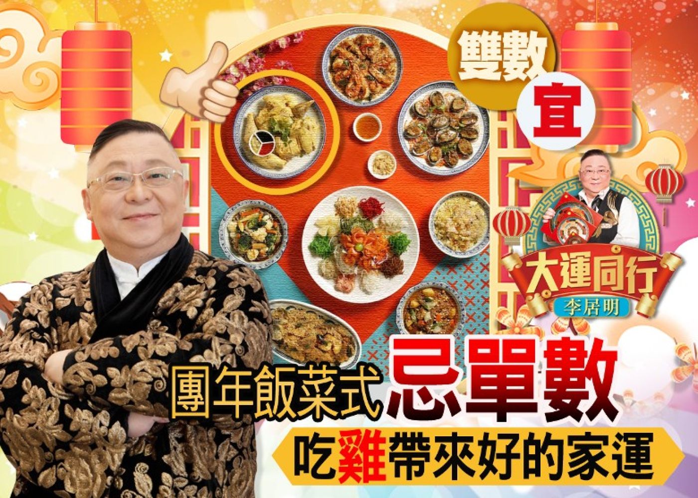 年三十晚吃團年飯,當然最好在圓桌上吃。要有十二碟餸菜,可包括湯水,代表一年的十二個月,這個「十二」是天數或宇宙密碼,而團年飯菜式不可單數,過年一定要吃雞,雞與「起」、「吉」諧音,意謂起家,置業興家,帶來好的家運。