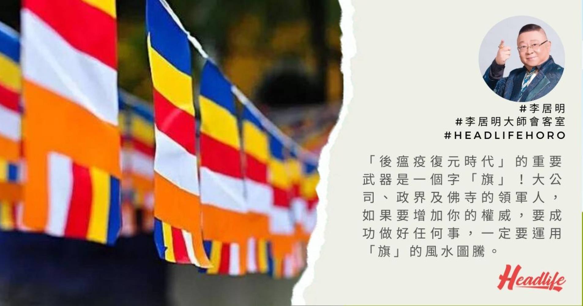 「後瘟疫復元時代」的重要武器是一個字「旗」!我提議大公司、政界及佛寺的領軍人,如果要增加你的權威,要成功做好任何事,一定要運用「旗」的風水圖騰。想不到「國旗效應」很熱烈,無論是政界還是民間,你都會發現他們身邊,普遍都多了一樣東西,就是李居明講的「旗」。