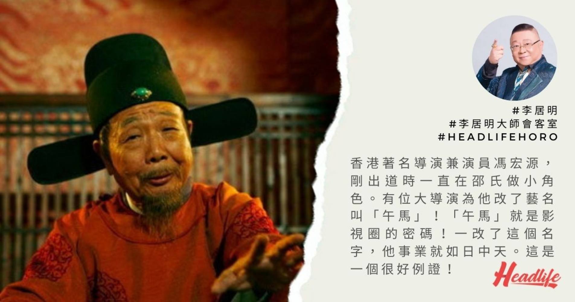 香港著名導演兼演員馮宏源,剛出道時一直在邵氏做小角色。有位大導演為他改了藝名叫「午馬」!「午馬」就是影視圈的密碼!一改了這個名字,他事業就如日中天。這是一個很好例證!