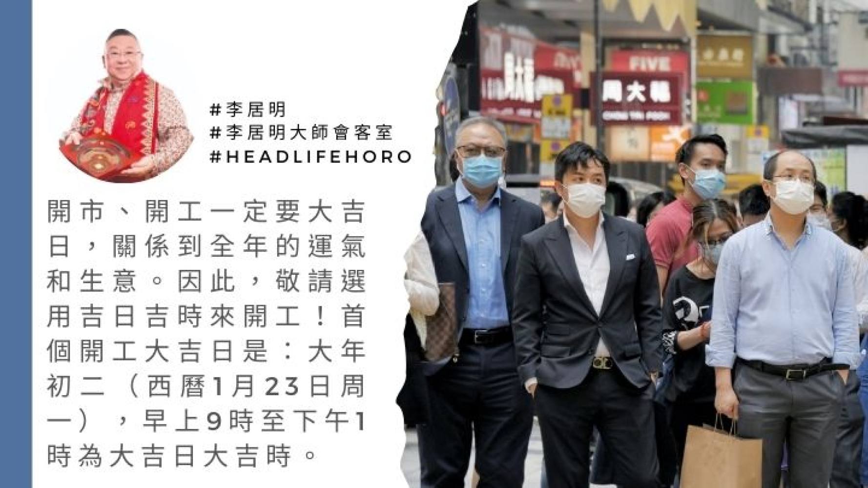 首個開工大吉日是:大年初二(西曆1月23日 周一),早上9時至下午1時為大吉日大吉時。
