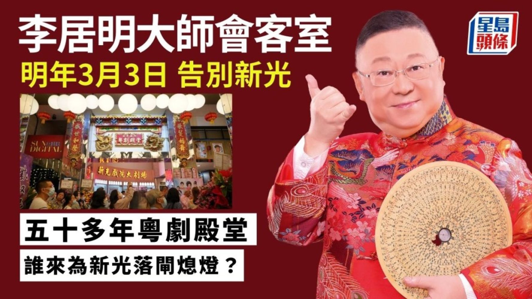 此劇作為推動近代史粵劇的第五套,首演時口碑載道,將於3月2日及3日演出兩場。3月3日晚是歷史時刻與新光告別,《小平你好》最後一響鑼鼓聲後有落閘熄燈儀式,希望大家一起來參與和支持!同時,我也向大家公布好消息,新光引退後「當代粵劇團」隆重成立,於九龍新港中心自置物業,佔地五千餘方呎,為未來香港文化事業繼續努力,已定名為「李居明文化會館」。蛇年賀歲粵劇《粵劇特朗普》,以及《金玉觀世音》、《秦王孟姜》、《小平你好》門票已公開發售,新光最後緬懷,請來拍照打卡!