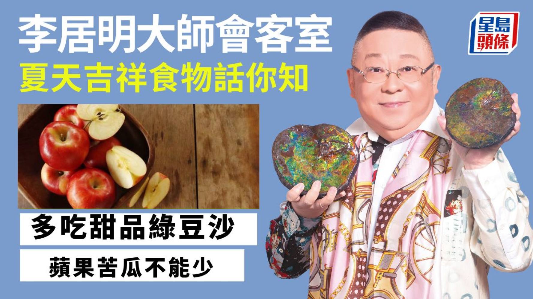 這段時間最好的水果是蘋果,因為蘋果可以散熱,第二是苦瓜,苦瓜炒牛肉很散熱。夏天最消暑的甜品是綠豆沙!紅豆沙較熱氣,不適宜在夏天吃,綠豆沙裏面最好加海帶和臭草,降火降熱!今年七月開班的八字高級班第一次公開四柱八字衍生出「六柱」、「七柱」怎樣看?機會難得,報名查詢︰2893 3072。