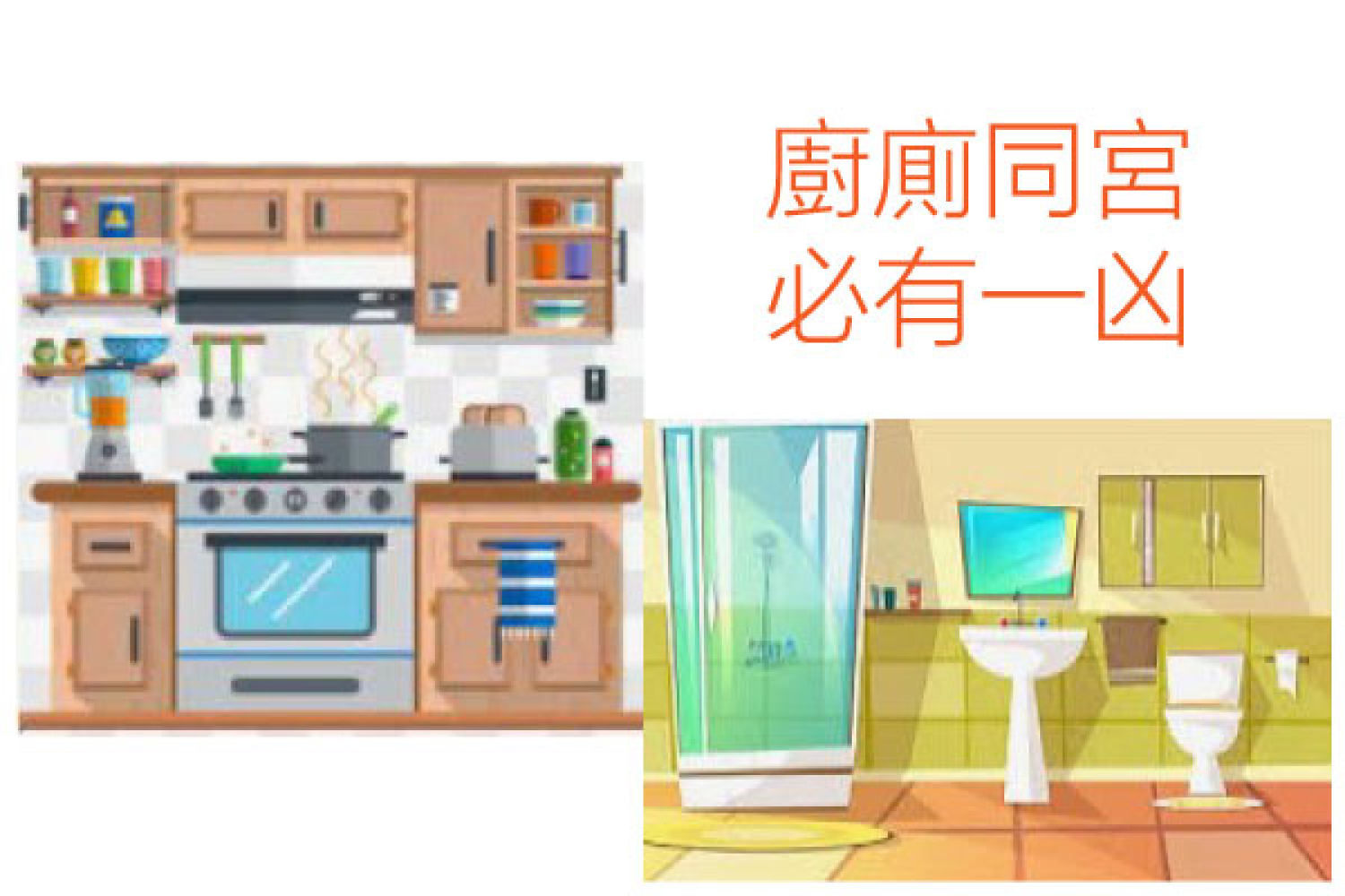 「廚廁同宮」容易有皮膚病。這廁所只宜洗澡用,最好避免在廁所大便,盡量在辦公室或公廁解決大便問題,否則影響家人皮膚疾病問題或腸臟健康。腸是人的第二個大腦,腸健康就不會有皮膚病。